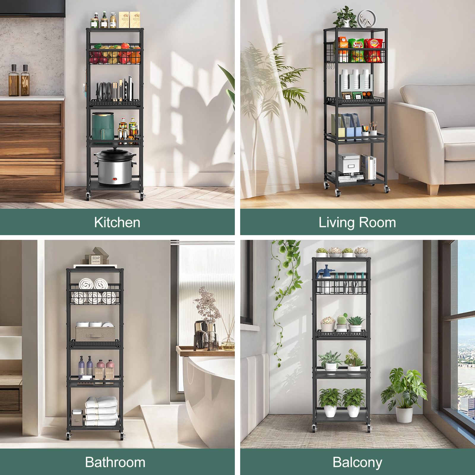 Versatile Storage Cart: Made from premium carbon steel, this sturdy 5-tier rack has reinforced wood shelves, a ventilated basket, and a pull-out organizer to store many kitchen items. Four side hooks maximize vertical space for hanging various tools.