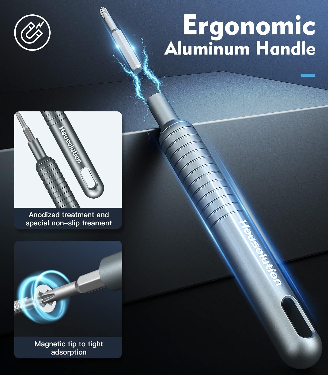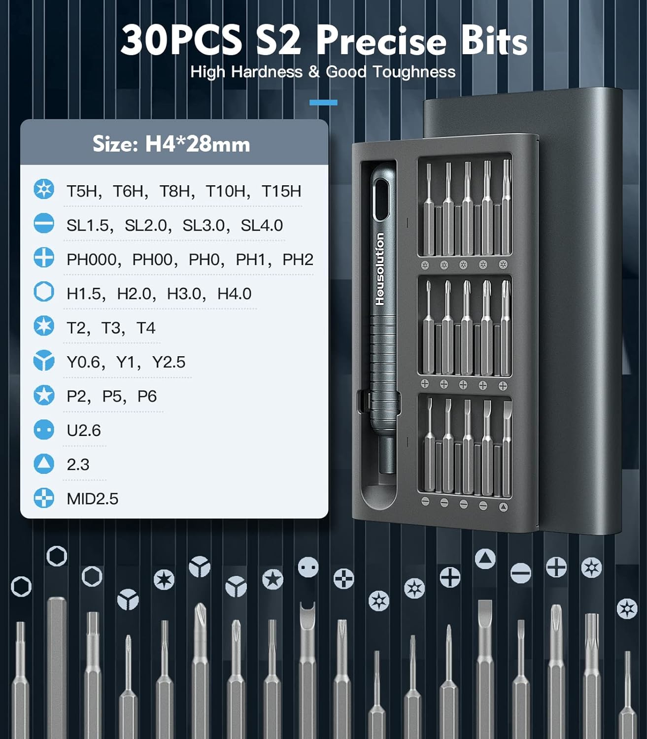 - 【30 S2 Precision Magnetic Bits】: Comes with 30 high-quality precision screwdriver kit bits for removing and replacing those tiny fasteners, covering almost all types of screws you can deal with. You just need to choose the bit that you need and put it into the hole of the handle, and the bit will be sucked tightly.Screwdriver bits is made of high precision S2 alloy steel, which has a much longer service life than bits made of chrome-vanadium steel (CR-V).