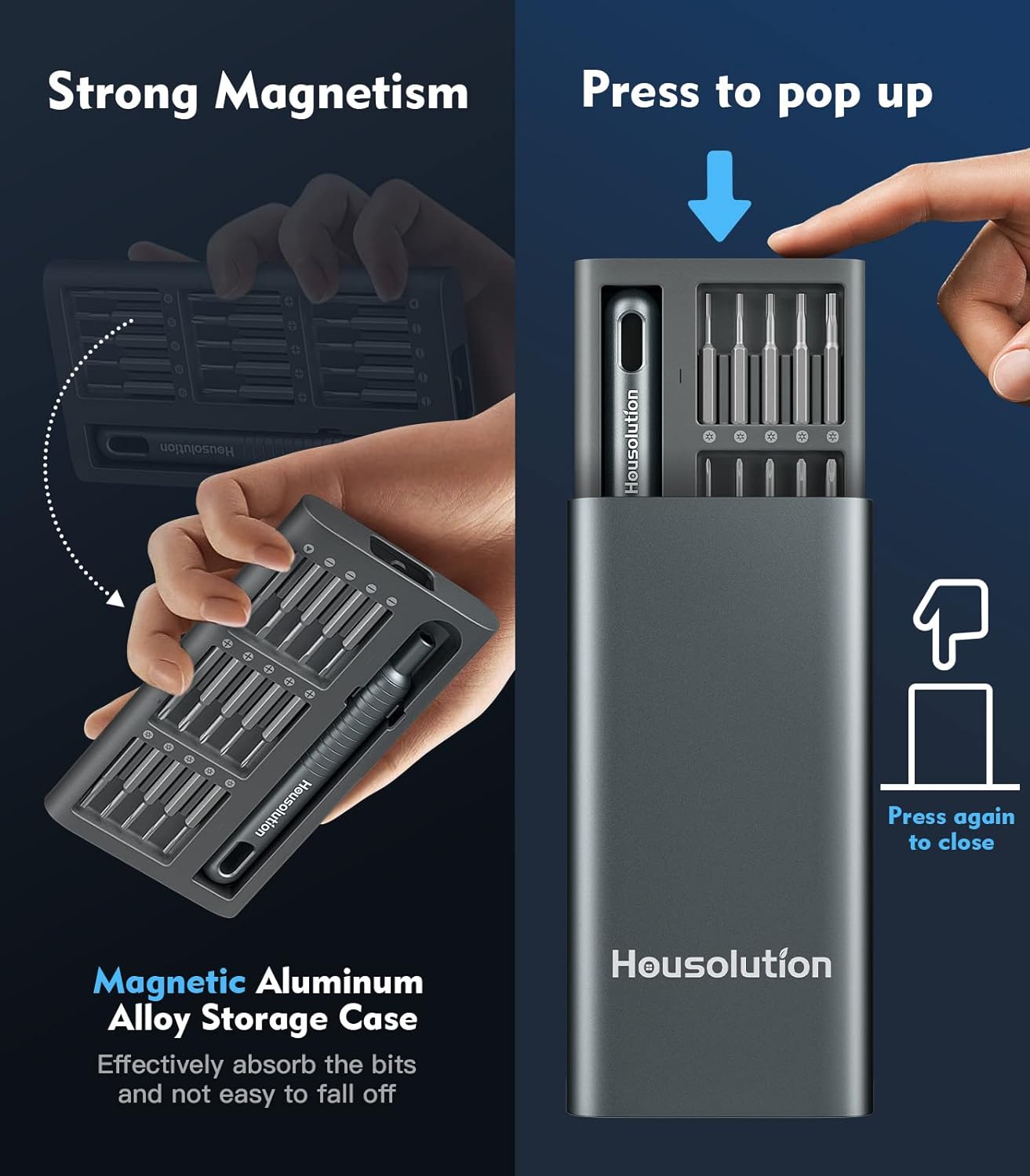 - 【Professional Magnetic Storage Cases】: This mini screwdriver set is well made aluminum case with dedicated separate labeled compartments for different screw heads storage, the bits will remain firmly in place all the while due to the magnetization. Now you no longer have to worry about losing the drill bit. The push pop-out mechanism of the case makes it user-friendly, easy to retrieve and put back.