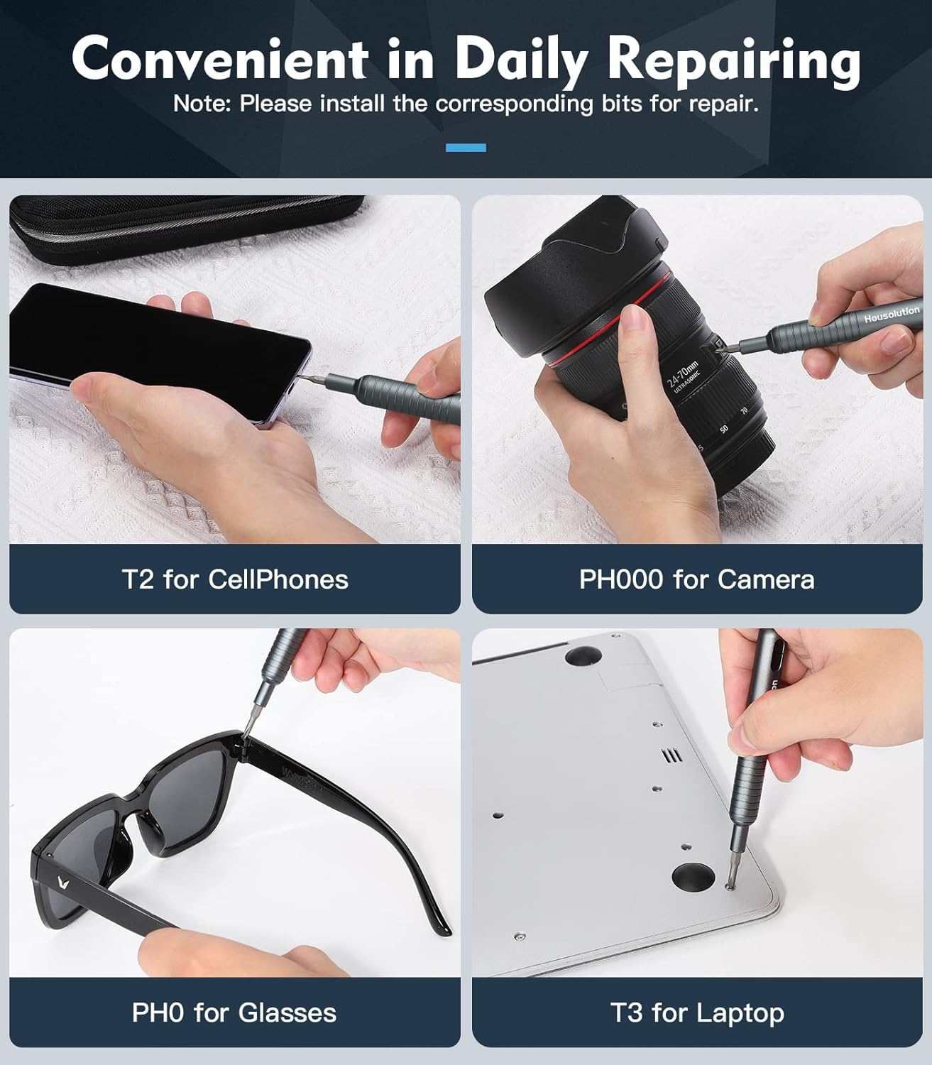 - 【Magnetic Screwdriver Kit】: This precision screwdriver set is suitable for repairing quartz watches, mobile phones, tablets, cameras, glasses, keyboards, drones and other equipment, meeting your daily needs.30pcs screwdriver bits: Phillips (PH000/00/0/1/2), Torx (T2/3/4), Torx Security (T5H/6H/8H/10H/15H), Flathead (SL1.5/2/3/4), U-shaped (U2.6), Hexagon (H1.5/2.0/3.0/4.0), Tri-point (Y0.6/1/2.5), Pentalobe (P2/5/6), 2.5, 2.3.